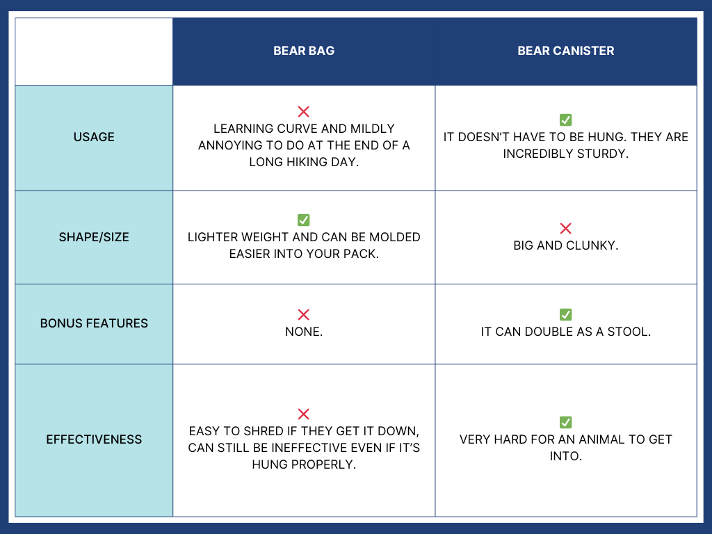 So while bear bags for food hangs are being discouraged, here is a comparison between bear bags and bear canisters so you can understand the difference between the two products: