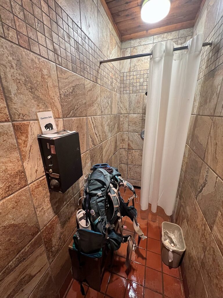 Ultimately, when it’s pouring, morale gets low quickly, and you start to feel less and less human. Having a bathroom with water, toilets, soap, trash cans, etc., close by and a bear box for food that keeps it protected and dry overnight, just that little extra, really helps us leave a bit more motivated in the morning.